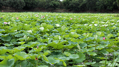 鸟儿们在蓝天白云下、微澜碧波中或引吭高歌,或低声细语。远远望去,树木林立、花草芬芳、绿草遍布,好一幅水下森林繁茂、鱼翔浅底,水面碧波粼粼,水上荷花绽放的水域立体图画。