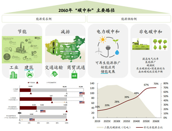 根据我国碳排放结构,要实现“2060碳中和”目标需要从需要从供给侧与需求侧双管齐下。其中供给侧电力系统能源转型是关键步骤;而工业、建筑等领域的节能减排也不可或缺。