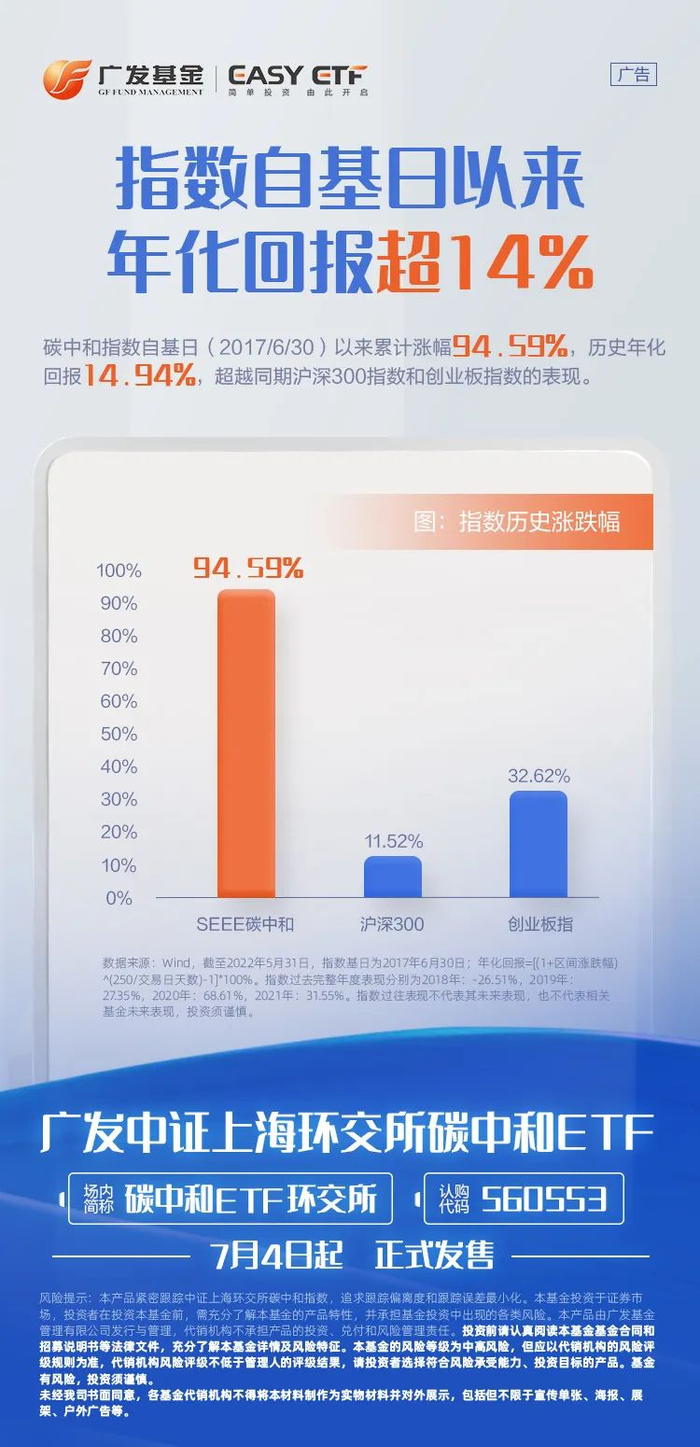 广发中证上海环交所碳中和ETF(场内简称:碳中和ETF环交所,认购代码:560553)紧密跟踪中证上海环交所碳中和指数,将于7月4日起正式发售。
