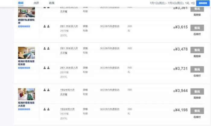 为此,《华夏时报》记者在6月29日登录查看了携程网、去哪儿网和美团的酒店预订情况,发现三亚文华东方酒店7月1日-3日部分房型已经售完,而这些房源的价格均在3300元/晚起。
