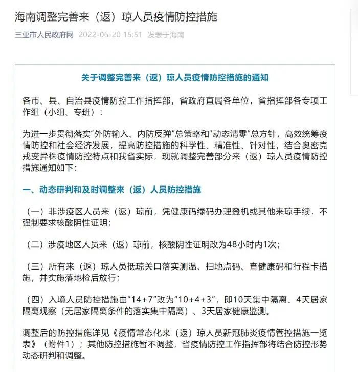 据《华夏时报》记者了解,6月20日,海南省新冠肺炎疫情防控工作指挥部发布《关于调整完善部分来(返)琼人员疫情防控措施通知》(以下简称《通知》)。《通知》明确,动态研判和及时调整来(返)琼人员防控措施:非涉疫区人员来(返)琼前,凭健康码绿码办理登机或其他来琼手续,不强制要求核酸阴性证明;涉疫地区人员来(返)琼前,核酸阴性证明改为48小时内1次;所有来(返)琼人员抵琼关口落实测温、扫地点码、查健康码和行程卡措施,并实施落地检后放行。