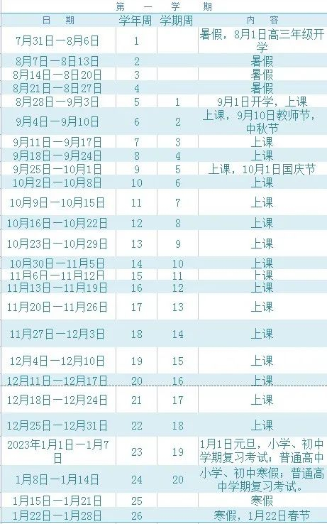 第一学期 2022年9月1日开学,寒假从2023年1月15日开始