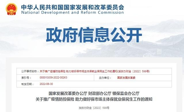 日前,国家发展改革委办公厅、财政部办公厅、银保监会办公厅联合下发《关于推广疫情防控保险助力做好保市场主体保就业保民生工作的通知》将结合部分地区工作经验,推广疫情防控保险,助力做好保市场主体保就业保民生有关工作。
