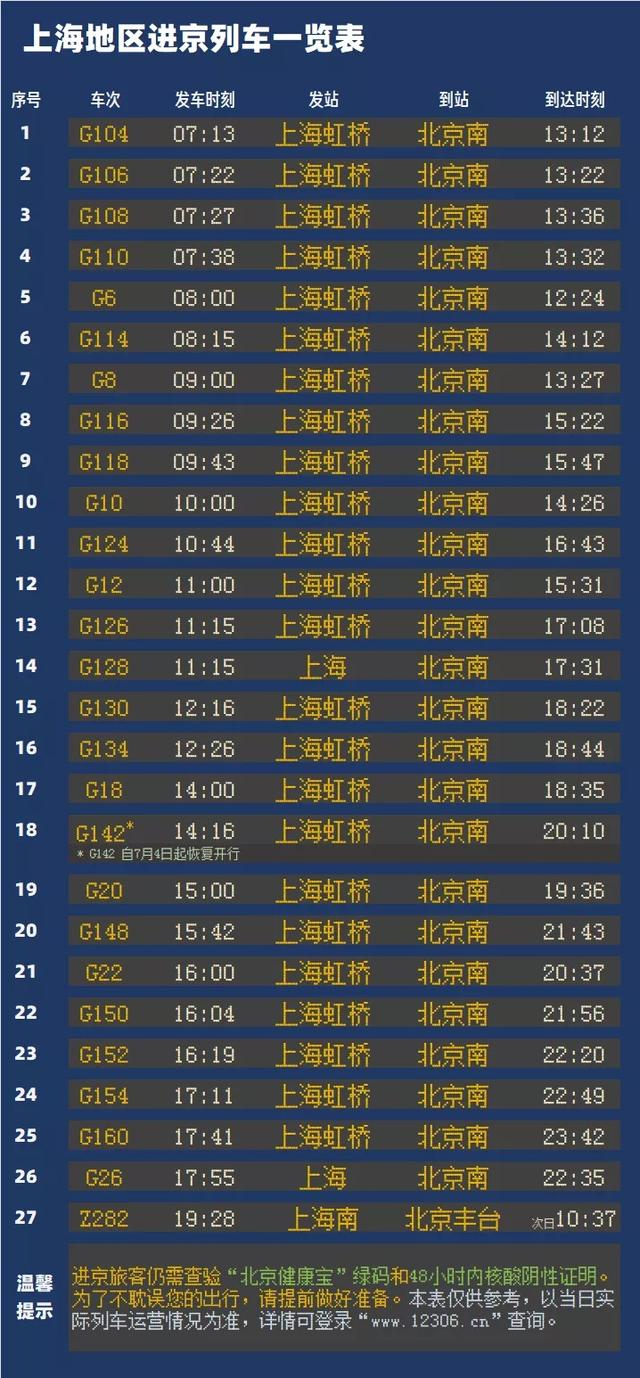 据铁路上海站官微消息,7月2日起,上海地区逐步恢复开行进京列车。具体开行列车时刻如下: