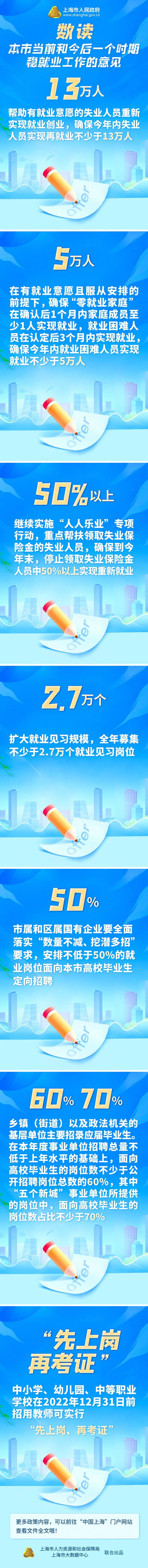 近日,《关于做好本市当前和今后一个时期稳就业工作的意见》已正式出台。《意见》提出了五方面二十条针对性举措,包括确保今年内失业人员实现再就业不少于13万人、确保到今年末停止领取失业保险金人员中50%以上实现重新就业、中小学教师在2022年12月31日前可“先上岗再考证”……更多数据带你一图读懂↓