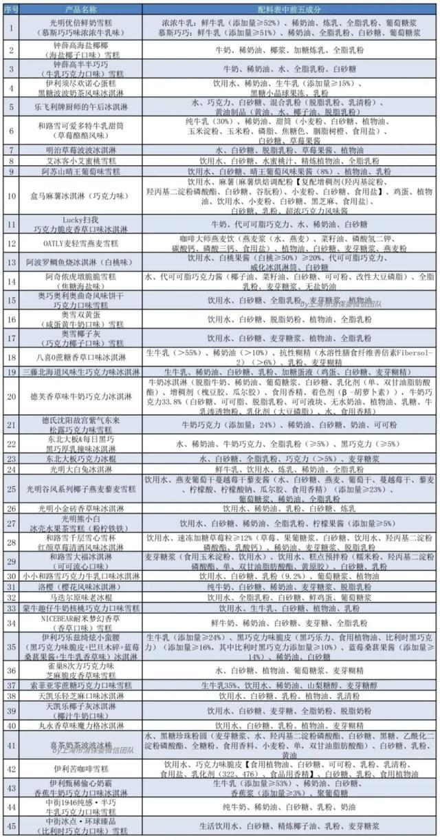 最后,上海市消保委微信团队按照扒配料的惯例,把45款冷饮产品配料表里排前五的成分都整理出来啦,由于表格里的文字是小编人肉码上去的(我们的小编正眼花中~)如果您发现有错字,请告诉我们,我们马上更正!