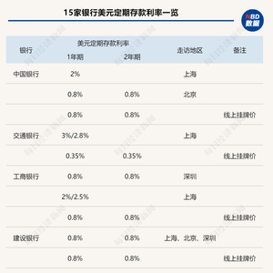 7月1日,每经记者从建设银行上海某支行了解到,该行美元定期存款1年期和2年期利率均为0.8%,即挂牌利率,在此基础上没有上浮。工作人员表示,上海地区建行网点利率水平一致。
