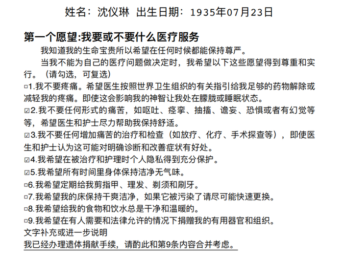 通过填写《五个愿望》,沈老师指明,她希望由女儿和孙女帮助她度过最后的生命时光。她拒绝了任何增加身体痛苦的治疗和检查,包括放疗、化疗、手术探查等,也不要有任何形式的痛苦,如呕吐、痉挛、抽搐、谵妄、恐惧或者有幻觉等。她希望在被治疗和护理时,个人隐私得到充分保护,身体保持洁净无气味。