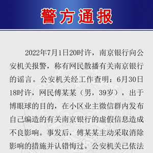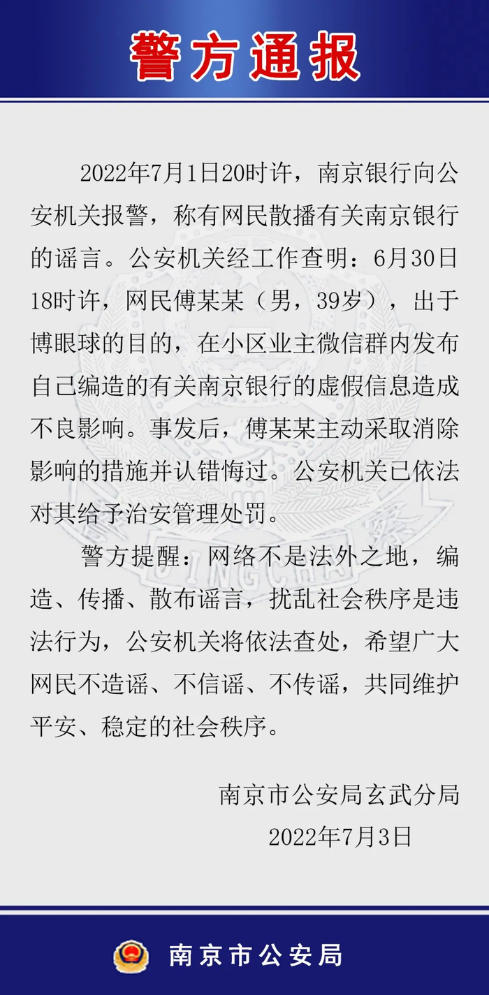 “南京警方”7月3日通报:7月1日20时许,南京银行向公安机关报警,称有网民散播有关南京银行的谣言。公安机关经工作查明:6月30日18时许,网民傅某某(男,39岁),出于博眼球的目的,在小区业主微信群内发布自己编造的有关南京银行的虚假信息造成不良影响。事发后,傅某某主动采取消除影响的措施并认错悔过。公安机关已依法对其给予治安管理处罚。