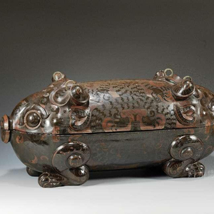 用于盛放耳杯。厚木胎,盖与器身内腹壁皆挖制,外形雕刻。盖身为双首连体的猪形,四足蹲伏,憨态可掬,是神话动物“并封”的形象。两端握手呈猪嘴状,各有销拴固定,以免滑动。全器内髹红漆,外髹黑漆为地,用红、黄、灰、棕红等色在地漆上绘花纹。器物的中部绘四条对称的单首双身龙,龙首下伏于器足两侧腿部上方,八条龙尾两两并列蜷曲于四角的内侧。两端龙首的附近皆绘变形凤鸟纹、卷云纹。另在器首两端头部的上下两侧、耳、足前方绘一组共八幅小画面的宴乐狩猎图。