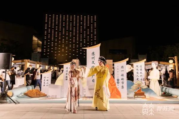 近两天,苏州博物馆西馆首次在夜间开放了。特别的是,博物馆西馆所在的狮山广场打造了一条沉浸式江南集市长廊。从老苏州经典美味,到各种有趣好玩的非遗、音乐,再到好吃好看的糕点、茶艺……集市长廊连接现代生活,展示非遗文化魅力。