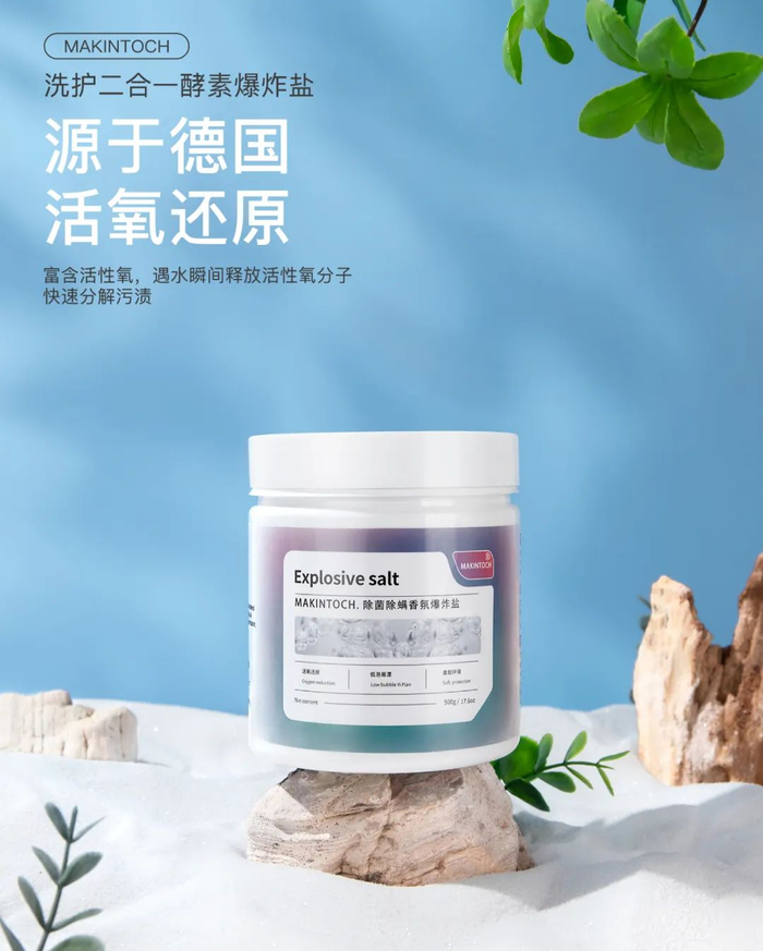 爆炸盐里的活性生物酶是有机物“克星”,利用活性氧打开衣物纤维大门,然后把黏在衣服上的顽固污渍给“扒拉”下来!