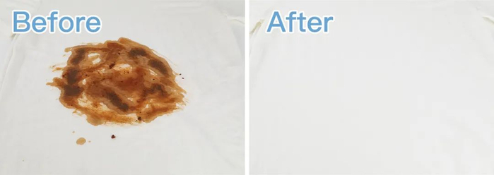 衣服一放进去,清洁分子就像“吞食食物”一样,油污肉眼可见的被“分食”干净!