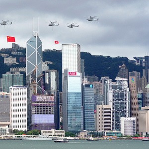 2022年7月1日早晨,香港特区政府庆祝香港回归祖国25周年升旗仪式在金紫荆广场举行,分别悬挂五星红旗和香港区旗的直升机编队飞过维港上空。 中新社记者张炜/人民视觉 图