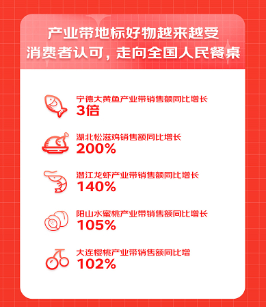 受益于冷链物流系统建设愈加完善,很多产业带地标好物开始从区域走向全国。其中,具有高蛋白,低胆固醇的宁德大黄鱼产业带销售额同比增长3倍,是今年地标产品中增长最快的。来自湖北体壮肉实、天然无污染的松滋鸡销售额同比增长200%,更多“吃鸡爱好者”实现了“吃鸡”自由。
