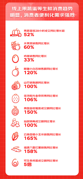 以往,消费者更多在超市购买果蔬蛋,今年,线上采购果蔬蛋等生鲜趋势明显。数据显示,新疆小白杏、山竹、佳沛阳光金奇异果、泰国金枕榴莲、仙居杨梅、云南香糯小玉米、福建六鳌红薯、可生食鸡蛋等果蔬蛋平均成交额均出现大幅增长,其中可生食鸡蛋成交额同比增长5倍。
