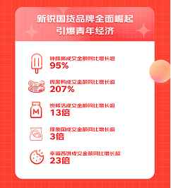 值得注意的是,今年一大波兼具颜值与实力的新国货品牌颇得消费者追捧。其中,幸福西饼成交金额同比增长超23倍,成为今年消费增速的黑马。周黑鸭成交金额同比增长超207%,网红雪糕钟薛高成交金额同比增长超95%,妥妥的国货之光。