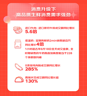 随着消费升级,消费者对进口牛排、鲜奶、纯肉肠、高端水饺等高品质生鲜需求增长迅猛。数据显示,进口原切牛排成交额同比增长5.6倍,0添加纯肉肠成交额同比增长285%,而定期购鲜奶2分钟内销售即破百万,同比增长4倍,销售的牛奶瓶叠加高度相当于228个珠穆朗玛峰。
