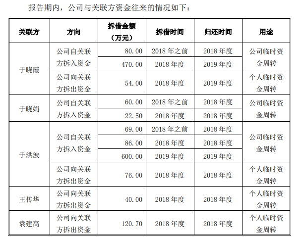 2018年劲旅环境关联方与公司存在多起资金往来。公司向于晓霞、于晓娟、于洪波拆入资金550万元、755万元、155万元合计1387万元。公司向于于晓霞、于洪波、王传华、袁建高拆出资金54万、76万元、40万元和120万元。公司称拆入资金用途为临时资金周转。