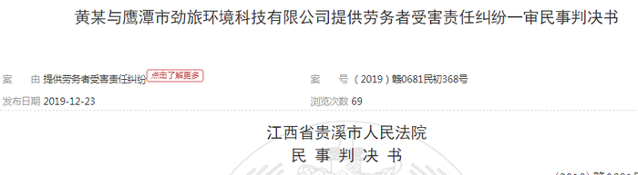例;原告:黄某,男,被告:鹰潭市劲旅环境科技有限公司2019年2月15日立案江西省贵溪市人民法院判决,由被告鹰潭市劲旅环境科技有限公司赔偿原告黄某各项损失共计22185.28元。案件受理费1610元,由被告鹰潭市劲旅环境科技有限公司负担。