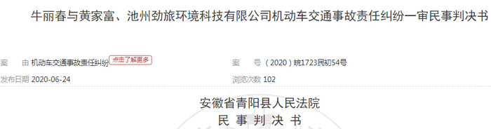 例;牛丽春与黄家富、池州劲旅环境科技有限公司机动车交通事故责任纠纷安徽省青阳县人民法院2020年1月8日受理判决,被告池州劲旅环境科技有限公司赔付原告牛丽春交通事故各项损失计73168.74元。
