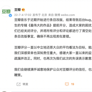 豆瓣表示:“豆瓣评分一直以中立地还原大众平均看法为目标,能成为大家读书观影听歌的参考,我们深感荣幸也深知责任重大,感谢大家一直以来的监督及包容,让我们更及时地发现疏漏并改正。同时,也再次为我们此次的失误表示歉意。我们会继续满怀诚意地保护公众对豆瓣评分的信任,也欢迎大家继续对我们进行监督和鞭策。”