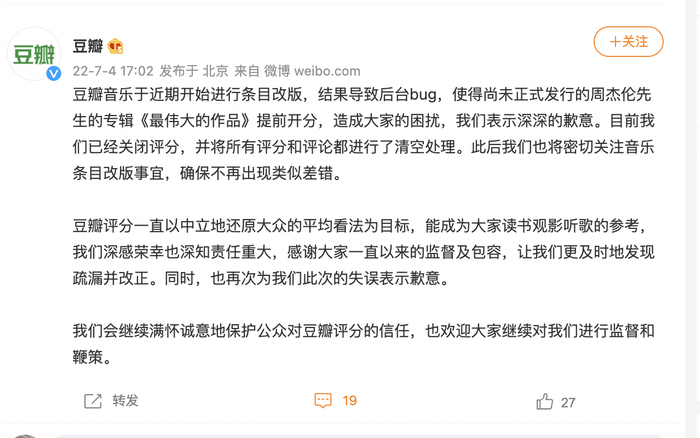 周杰伦新专辑未发豆瓣先开分,豆瓣道歉:已关闭评分