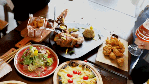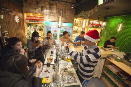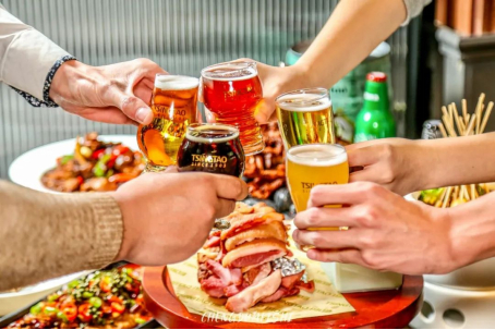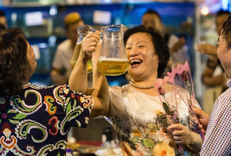 青岛大姨在青岛啤酒博物馆音乐餐吧里,交杯畅饮。