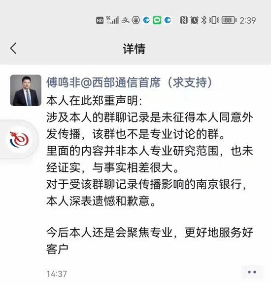 客观而言,对于银行来说,存款安全是关乎生存的大事,不良言论的传播会导致南京银行陷入危机。而券商分析师作为公众人物,一言一行都被社会和媒体广泛关注,傅鸣非相关言论尺度和范围震惊金融圈,让不少网友替他捏了一把汗。事后(7月1日下午14:37),傅鸣非在朋友圈紧急声明并致歉。