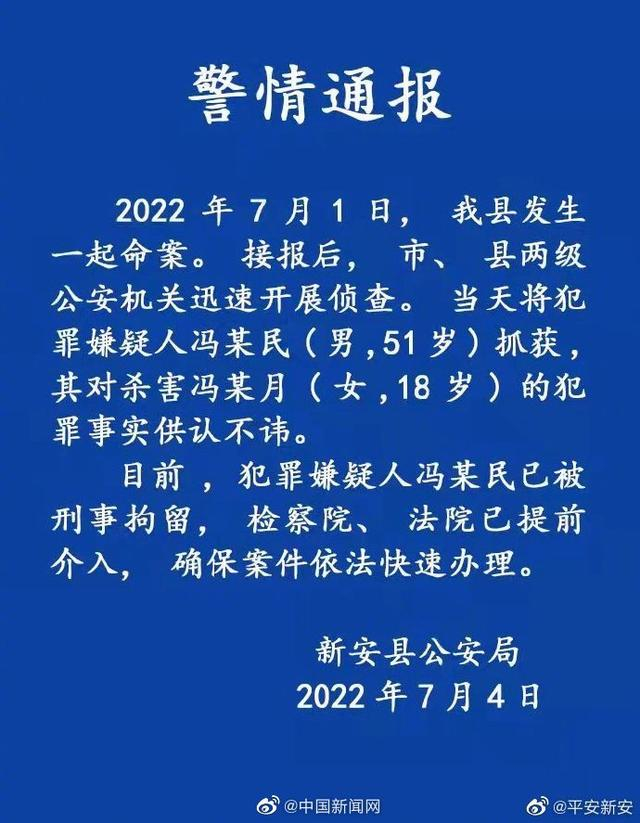 4日,@平安新安 发布警情通报:2022年7月1日,该县发生一起命案。 接报后,市、县两级公安机关迅速开展侦查。 当天将犯罪嫌疑人冯某民(男,51岁)抓获,其对杀害冯某月(女,18岁)的犯罪事实供认不讳。目前,犯罪嫌疑人冯某民已被刑事拘留, 检察院、 法院已提前介入, 确保案件依法快速办理。