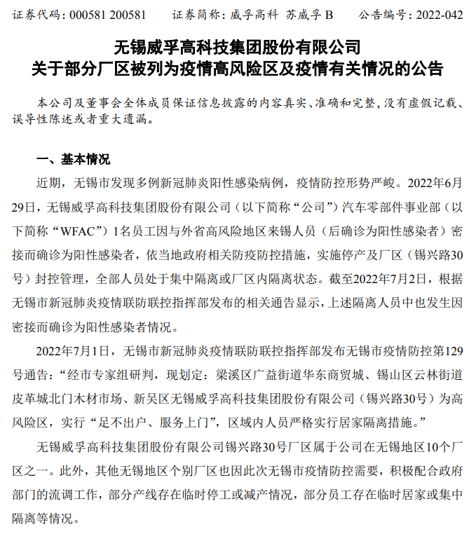 7月4日晚间,上市公司威孚高科公告,其汽车零部件事业部(WFAC)1名员工因与外省高风险地区来锡人员(后确诊为阳性感染者)密接而确诊为阳性感染者,依当地政府相关防疫防控措施,实施停产及厂区(锡兴路30号)封控管理,全部人员处于集中隔离或厂区内隔离状态。经无锡市专家组研判,新吴区无锡威孚高科技集团股份有限公司(锡兴路30号)列为高风险区。
