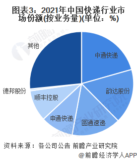 2021年,中国快递行业上市企业中,中通快递业务量市场份额最高,超过了20%;其次是韵达股份和圆通速递,市场份额均超过15%;上述三家头部企业市场份额合计超过50%。