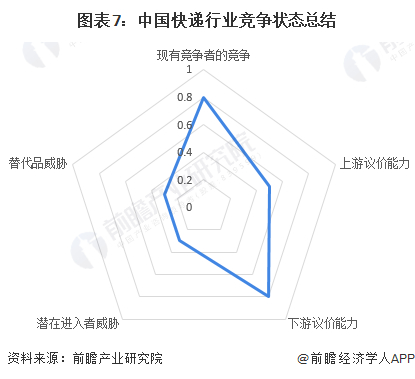 从五力竞争模型角度分析,由于快递服务具有特殊性,市场上很难有其他的服务能代替快递服务,顾客对该服务依赖性较强,因此,快递行业的替代品威胁较小;快递服务同质化严重,技术门槛低,较难实现差异化;再加上产业逐步趋于成熟,业务量增速放缓,快递行业的竞争程度异常激烈;上游供应商主要为运输车辆生产商、燃油供应商,为了降低成本、加强对车辆的管控力度,越来越多的快递公司用自有车辆来代替外部车辆,因此上游议价能力一般;快递服务同质化严重,差异性小,并且购买者的转换成本较小,压价能力较强,因此,下游议价能力较强;同时,随着头部企业在成本和服务端的不断优化,快递行业进入壁垒较高,潜在进入者威胁较小。