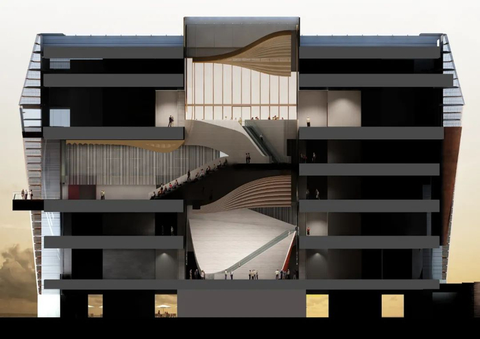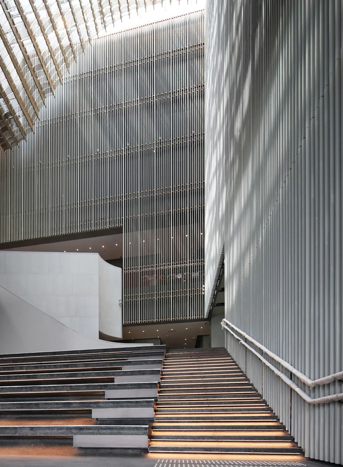设计团队于地面、二楼及四楼分别设计了三个面向不同方位的中庭空间,参照紫禁城中轴空间平面递进的布局,层层递进贯穿整座大楼,引领访客向上层参观。