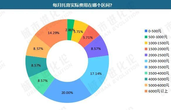 未送托家庭对托育费用的预期值集中分布在1000-3000元。根据已送托家庭反馈,实际托育费用集中在2500-3500元,占比37.14%,还有14.29%的家庭托育费用在6000元以上。