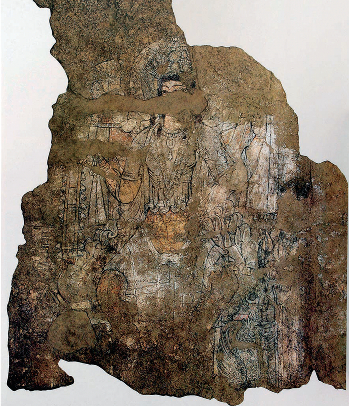 黄夏和西林孝浩将文献记载与实物进行比对,西林为还原曹仲达的绘画样式,深入考察了粟特地区考古遗存,亦赞同刘建华与藤冈穰将河北高叡造三尊佛像与曹家样联系的观点。西林一文广泛收集粟特故地考古材料,如片治肯特(Panjikent)城市遗址第25区第28室北壁东端门内壁上方拱形部分残存的如来坐像与菩萨像(690-720)、第14区祝宴人物像、片治肯特遗址II号神殿佛坐像、阿弗拉西亚卜(Afrasiyab)南壁骆驼人物(7世纪中期)、阿吉那特佩第31室壁画人物残片(7世纪末-8世纪初)等。上述神祇或人物的衣纹密集如波纹,此种衣纹源自波斯萨珊的雕刻与绘画,传入粟特后随粟特人的流动而传布到中亚、东亚各地。由此,西林认为曹仲达极可能为粟特美术的实践者。其研究细致丰富,予人启发良多。