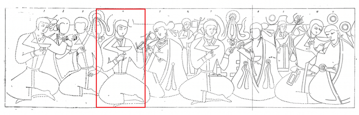 〔图五〕 巴拉克雷特佩 (Balalyk-tepe) 遗址第14室南壁壁画线描图 5-6世纪,巴拉克雷特佩(Balalyk-tepe) 遗址第14室南壁, 乌兹别克斯坦 采自L. I. Al’baum, Balalyk-tepe, fig. 96, Tashkent, 1960