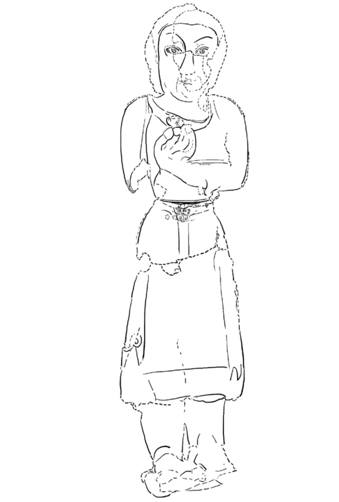 〔图六〕 银质小像线描图 约550-575年 高38.5厘米 德扎尔特佩(Dzartepa)II号祠庙遗址,乌兹别克斯坦绳琳琳绘图, 此据[日]加藤九祚《ウズベキスタン考古学新発見》,東方出版社,2002年,图80