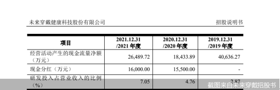 数据显示,2020年、2021年,未来穿戴现金分红金额分别为1.55亿元、1.6亿元,而同期公司实现归属净利润分别约为1.43亿元、1.32亿元,经北京商报记者计算,公司当年分红金额分别是同期归属净利润的1.08倍、1.21倍。