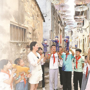 微改造、精提升后的歙县竹铺老街上,当地学生跟着老师学非遗技艺。记者 潘成 摄