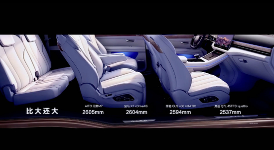 只讲参数可能无法理解,问界贴心地放出了与友商的数据对比。不过这回拉出来的不是埃尔法,而是宝马X7、奔驰GLS和奥迪Q7L这些中大型SUV。显而易见,问界M7的数据表现更优秀,甚至它还自创了一个新词——“比大还大”。