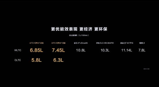 以油耗为例,问界M7后驱版WLTC百公里油耗为6.85L,理想ONE为8.8L。值得一提的是,在发布会上,问界M7还拉上了理想L9 7.8L的百公里油耗做对比。