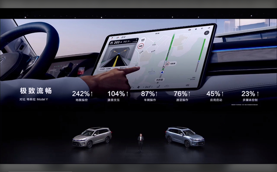 为了进一步显示车机的流畅度,问界M7拉来了特斯拉Model Y做对比,给出了地图操控提升242%、语音交互提升104%、车辆操作提升87%、应用启动提升45%等数据。
