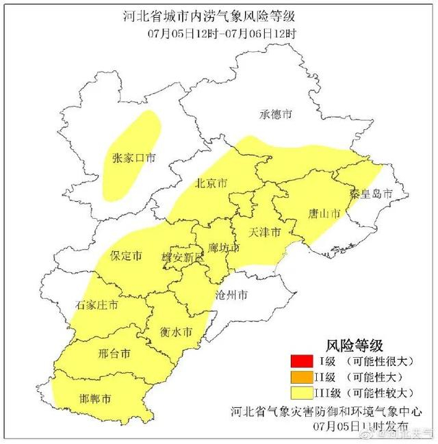 【河北省气象灾害防御和环境气象中心2022年7月05日11时发布城市内涝气象风险等级预报】今天下午到明天上午,张家口中部、承德南部、秦皇岛北部、唐山中西部、廊坊、雄安新区、石家庄中东部、沧州西部、衡水、邯郸大部城市内涝气象风险等级为Ⅲ级,发生城市内涝的可能性较大,请注意防范。