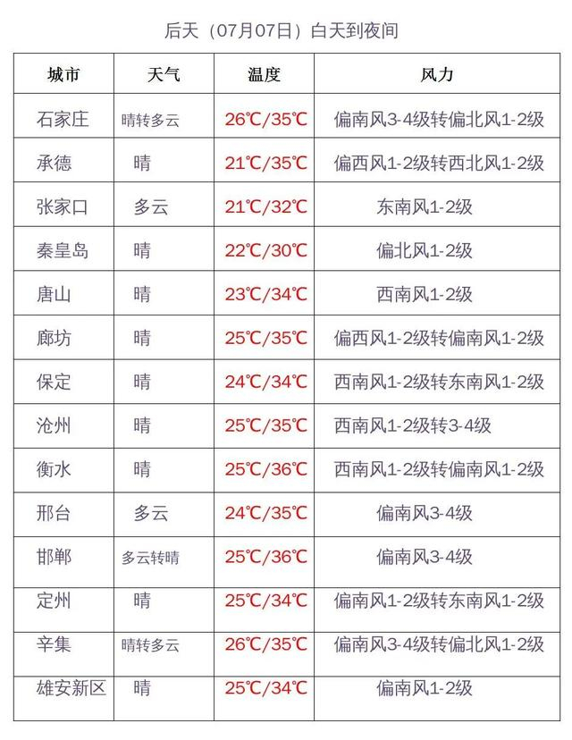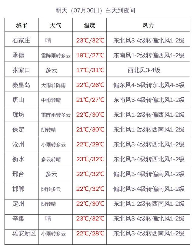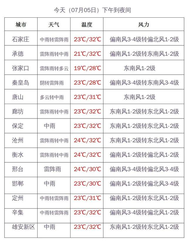 今天下午到夜间,全省阴有小到中雨,其中承德东部、唐山、秦皇岛、廊坊、保定东部、雄安新区、石家庄东部、沧州、衡水、邢台东部、邯郸东部有大雨,局地有暴雨,个别地点有大暴雨,雷雨时局地伴有短时强降水、短时大风等强对流天气。最高气温,张家口、保定西北部24~29℃,其他地区30~33℃。最低气温,张家口、承德、保定西北部12~21℃,其他地区22~25℃。