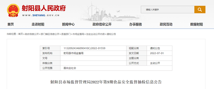 中国质量新闻网讯 据江苏省盐城市射阳县人民政府网站7月1日消息,根据《中华人民共和国食品安全法》、国家市场监督管理总局《食品安全抽样检验管理办法》等规定,射阳县市场监督管理局公布2022年第9期食品安全监督抽检信息如下: