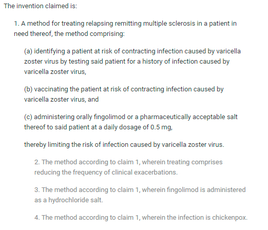 这件专利的四项权利要求,描述了一种治疗可能有感染水痘带状疱疹病毒感染风险的RRMS(复发缓解型多发性硬化)患者的方法。另,芬戈莫德的说明书中提到“在开始使用 GILENYA 之前,测试患者的水痘带状疱疹病毒(VZV)抗体;建议在开始使用 GILENYA 治疗之前对抗体阴性患者进行 VZV 疫苗接种”。