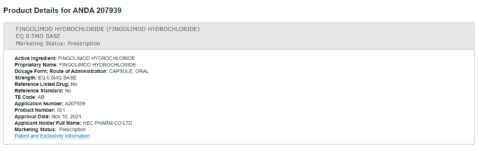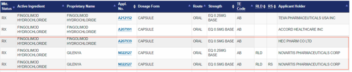 (HEC PHARM,?0.5mg Fingolimod, source: The Orange Book)