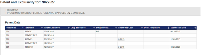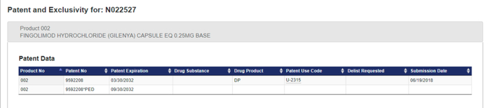 目前,橙皮书公开的诺华0.5mg规格的芬戈莫德专利信息如上。