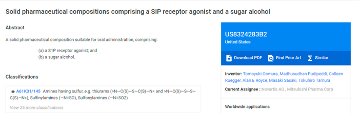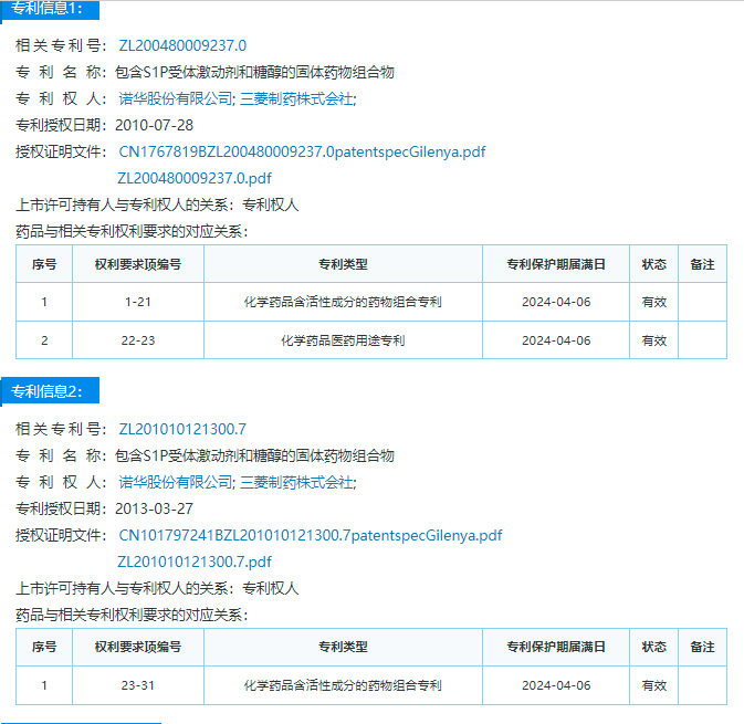 目光转向国内,知产宝药品专利数据库显示,针对盐酸芬戈莫德胶囊0.5mg规格,诺华公开了两件中国专利,均为组合物专利,专利保护期将于2024年4月届满。但目前尚无与之相关的专利挑战信息公开。